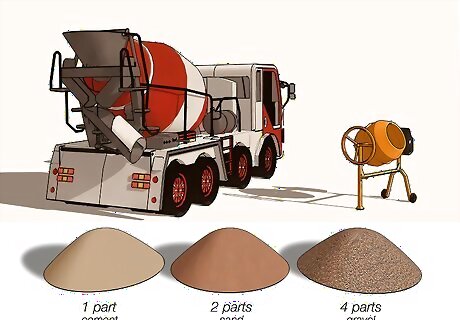 Mix your concrete. Concrete is mixed by adding together Portland cement, sand, and coarse aggregate (gravel) together in a ratio of 1:2:4. Water is added to the dry mixture to bind all the components together. In a concrete mixer, add the determined amount of water and then the concrete mix. You can also mix this in a wheelbarrow with a shovel. Use as little water as possible. Water makes the concrete more maneuverable but it also weakens the constitution of the final product. A drier mix makes the concrete more crack resistant. Turn on the machine. The mix will become smooth and consistent. Shut off the machine. Always wear a ventilated mask, safety glasses, gloves, and long sleeves and pants when mixing concrete.