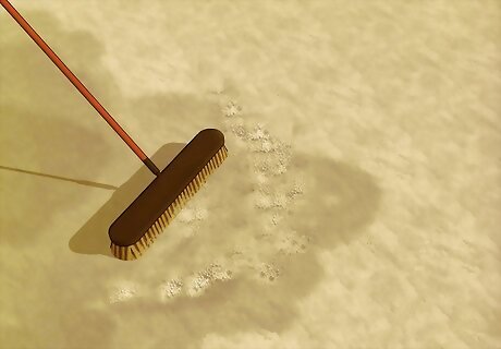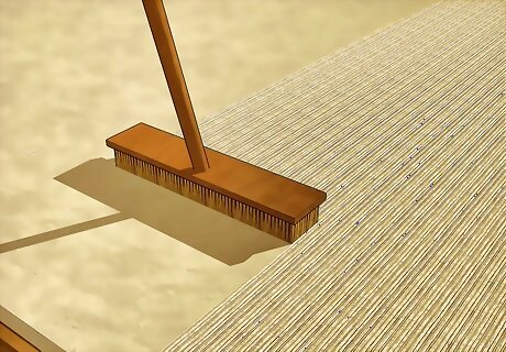 Create traction. Use a broom to sweep across the surface, creating designs. This will provide traction on the concrete so it is not as slippery when wet. A soft brush can also be used for a different texture that is less rough. For a smoother surface, but one that still has a pattern to it, you can use the trowel and slide it over the surface in a circular motion. Make sure the grooves are not so deep that water stands on the surface. Standing water will compromise the integrity of the concrete. If moving the broom over the concrete causes clumps of concrete to aggregate on your broom, it's too early to broom. Move over the concrete again with the magnesium floater to smooth out the pattern left by the broom, then try again later.