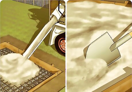 Pour the concrete into the mold. You can sometimes get a truck to pour concrete straight into your form; otherwise, load it into wheelbarrows and tilt them into the form until the high point is reached. While doing this, enlist some helpers to spread out the concrete with shovels, rakes and "come alongs," which is a special concrete rake.