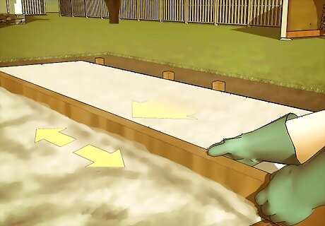 Screed the top of the concrete. Starting at the uphill point, use a screeding tool to flatten out the wet concrete. Screeding involves jiggling a wide plank of wood back and forth, if possible immediately over the forms, to create a flat surface. Work your way from top to bottom, gently screeding until you have a flat surface. Your concrete surface won't be finished yet, but it will begin to look more complete and professional looking at this point.