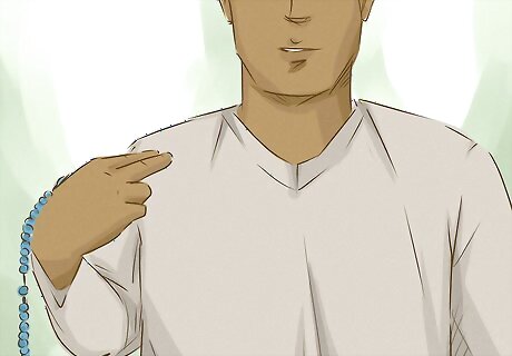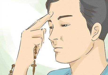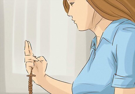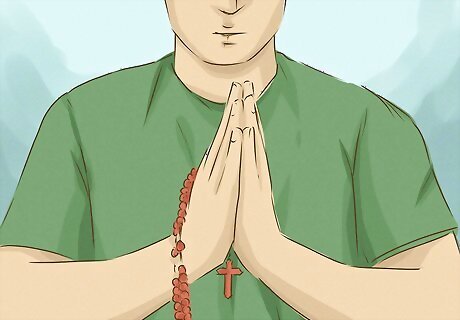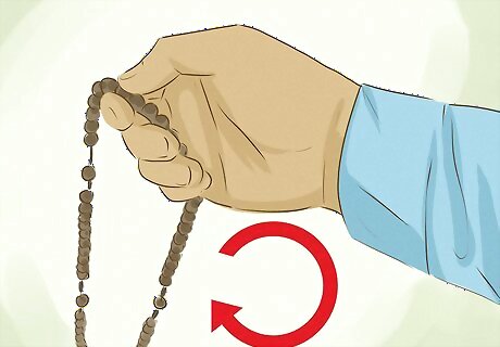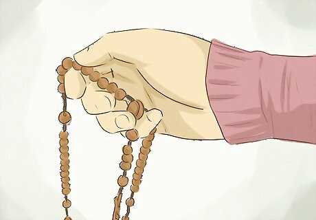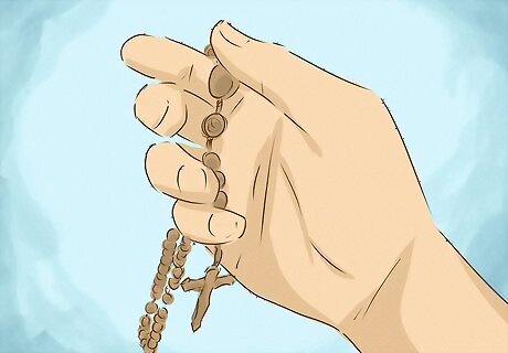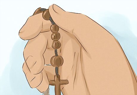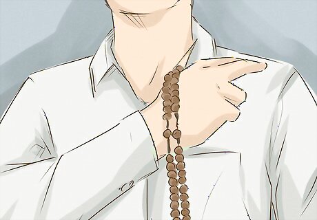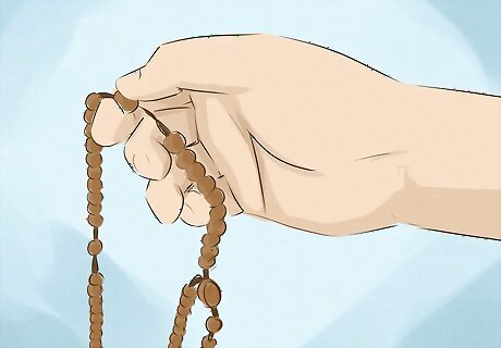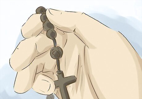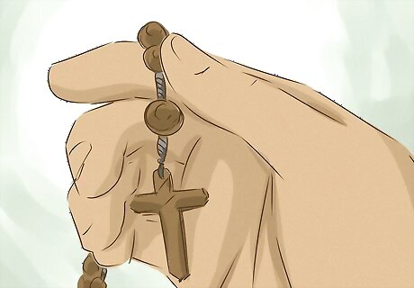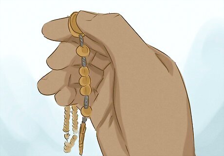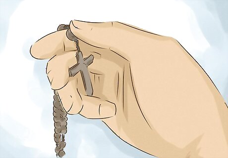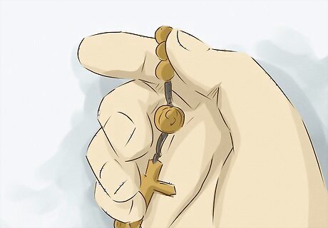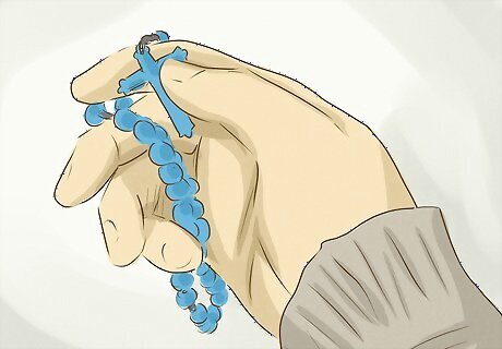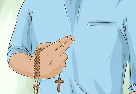 Hold your rosary in one hand. Most people prefer to gently grasp their rosary in their right hand. This allows you to more easily move the rosary around and touch each of the beads as you say each prayer. If you prefer to kneel, make sure that the rosary doesn’t touch the ground at any time.