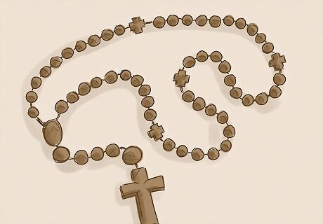 Familiarize yourself with the design of a traditional 5-decade rosary. There’s a small crucifix dangling from the end of the rosary. The string directly holding the rosary has a single large bead, 3 small beads, another large bead, and a small icon or image. The actual loop of the rosary is comprised of 5 “decades” of beads. A “decade” is 10 small beads followed by a large bead. The first decade begins on the left-hand side of the rosary and moves outward from the icon. The larger beads denoting the start/end of each decade are also called “Our Father” beads. The smaller beads in the middle sections are also called “Hail Mary” beads.