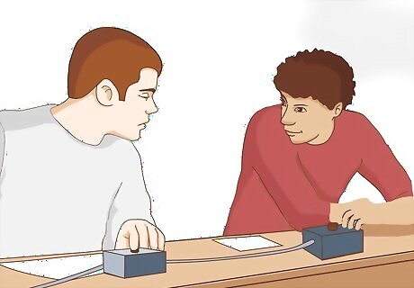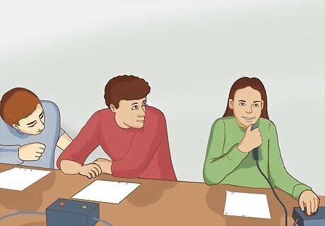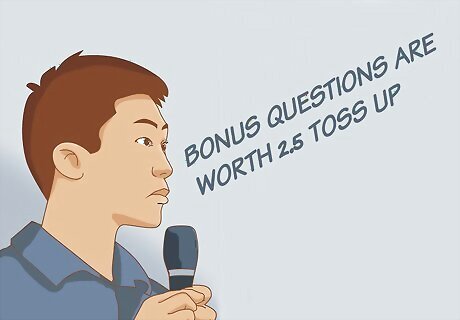Know the basic rules. These are: Answering after you buzz but before you are verbally recognized is known as a “blurt.” Blurts are treated like an incorrect answer to an interrupt (at least at the official Department of Energy competitions). Don’t blurt. If you have trouble doing this, don’t watch the moderator; only listen to him or her. Eye contact doesn’t count as recognition. If you still have trouble, put your backpack or some other large object between you and the moderator. Points are issued for a correct answer to a toss-up question. Collaboration is not allowed on toss-ups. If you say anything (except your answer, and then only if you are called on), your team will be disqualified from answering the question. Points are issued for a correct answer to a bonus question. Should your team answer a toss-up question correctly, you will earn a bonus question, which only your team is allowed to answer. Collaboration is allowed on bonus questions, and you are given longer to find the correct answer. The designated team captain must start giving the answer before time is called. The other team can’t make noise (especially by buzzing). Points are added to the other team’s score for an incorrect interrupt of a toss-up question or an interrupt blurt. Once one person on your team has either collaborated, blurted, or given an incorrect answer to a toss-up question, no member of your team may buzz. If you don’t know the answer, don’t buzz in early and prevent your teammates, who may know the answer, from answering. If you do know the answer, buzz quickly. If nobody on your team has buzzed about 3 seconds after the full question has been read, guess before the question expires.