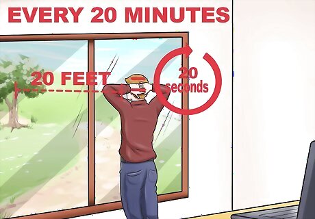 Protect your eyes while using screens. Sit at least a foot away from your computer or television, since the screens generate a low level of radiation. While no studies have established a correlation between lit screens and cataracts, you should try to distance yourself and limit screen time. This can improve your overall vision. Reduce glare that's harsh on your eyes by closing blinds. Adjust your computer monitor so the brightest light is at a 90°angle with your monitor. Don't forget you can also adjust the brightness and contrast to decrease eye strain. Follow the 20-20-20 method. Every 20 minutes, look away from your screen to any object 20 feet away for 20 seconds. It may help to set a reminder alarm.
