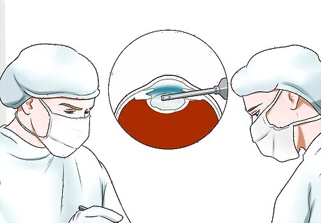 Get surgery for cataracts. Surgery is available to remove a cataract or cloudy lens that is a result of normal aging. It's replaced with another lens and you'll usually recover in about 24 hours. Your doctor may prescribe lubricating drops and antibiotics to prevent infection after the surgery. Cataracts that cloud the outside portion of the lens may not need to be removed because the central vision is spared. After the surgery, you may feel like you have a foreign body in your eye. This is usually caused by dry eyes from the stitches or a cut nerve. In the case of a cut nerve, it will take a few months to regenerate before you stop feeling the symptoms.