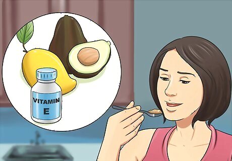 Get vitamin E. Vitamin E also contains antioxidants that can protect your eyes from harsh UV damage. Try to get your vitamins from a diet full of fruits and vegetables of a variety of colors. This variety will contain plant chemicals (phytochemicals) that can keep you in good health. If you supplement, follow the recommended daily allowance (22 IU for men or 33 IU for women). Or, get vitamin E from the following: Spinach Almonds Sunflower seeds Wheat germ Peanut butter Collard greens Avocados Mango Hazelnuts Swiss chard