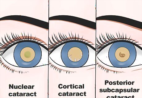 Determine what type of cataracts you have. Not all cataracts are the same, although cloudy visual disturbance is a general symptom. Cataracts are placed into four categories depending on their location, symptoms, and degree of vision changes. Types of cataracts include: Nuclear cataracts: These affect the center of the eye. At first, they can cause nearsightedness, but eventually the lens becomes yellow or brown. A main symptom is the inability to distinguish between colors. Cortical cataracts: These affect the edge of the lens. Whitish wedge-shaped opacities or streaks can extend to the center on lens and interfere with light. This means patients usually experience problems with glare. Posterior subcapsular cataracts: These begin with small or opaque areas that usually form in the back of the lens. Patients suffer from reading disturbances and sensitivity to bright light. Another symptom is seeing halos around bright lights, especially at night. Congenital cataracts: These cataracts form before birth, usually because of an infection the mother has at birth (such as rubella, Lowe syndrome, galactosemia, or muscular dystrophy). Pediatricians will check for the cataracts shortly after birth. If they block the central visual axis, the cataracts will need to be removed to prevent amblyopia (lazy eye). If the cataracts are small or off axis, surgery may not be necessary. Instead, the doctor may simply observe them.