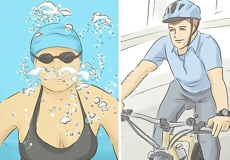 Warm up before exercising and cool down afterward. For instance, if you’re going to walk around a synthetic track for 30 minutes at a moderate pace, spend 5-10 minutes beforehand walking at a slower but steadily-increasing pace. Then, spend another 5-10 minutes afterward walking at a steadily-decreasing pace. Similarly, swim several slow-pace laps before and after doing your typical lap swim. Warming up helps loosen your joints and muscles, reducing the chance of discomfort and possibly injury. Cooling down can help to reduce stiffness and soreness after exercising.