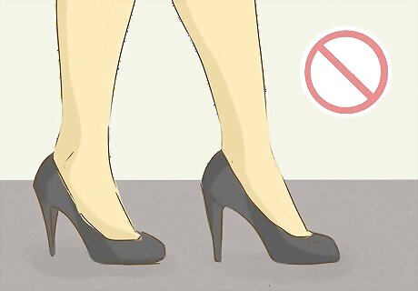 Wear comfortable shoes and avoid high heels. If your footwear provides a poor base for your body weight, your knees will suffer most. Shoes that fit properly and have cushioned soles can take a great deal of pressure off of your knees, making knee pain less likely. Avoid wearing high heels as much as possible. Consider going to a specialty shoe shop where you can be expertly fitted for shoes that meet your needs.