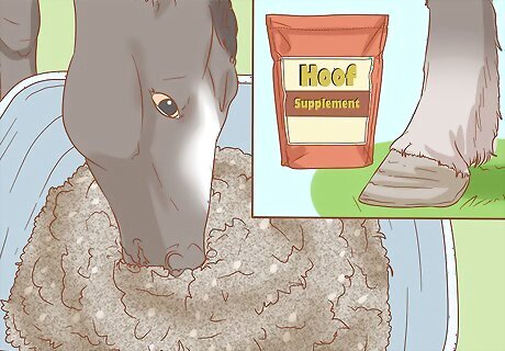 Add a hoof supplement to your horse’s diet if its hooves are weak. If you or the farrier notices that a horse’s hooves are brittle and dry, purchase a dietary supplement to strengthen the hooves. A good hoof supplement contains biotin, zinc, calcium, and copper may have other hoof-strengthening vitamins. Follow the directions printed on the supplement packaging, and you’re your horse as much of the supplement as directed. Biotin supplements contain vitamin B, which helps hooves grow. Biotin is found naturally in alfalfa, barley, and oats. However, these low concentrations are often not sufficient to help prevent laminitis.
