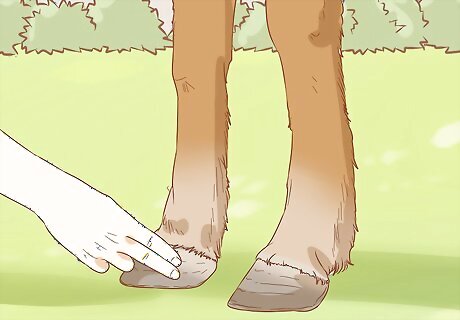 Check and clean your horse’s hooves every day. Maintaining your horse’s clean, healthy hooves is a crucial part of preventing laminitis. Clean any dirt, stones, and other objects from the central “V” of the hooves with a hoof pick. While you’re cleaning, inspect the horse’s hooves and make sure there are no signs of laminitis. Signs of laminitis include tenderness and heat in the hooves. Additionally, you might feel warmth or softness around the coronary band, which requires veterinary care. A horse with laminitis will also be hesitant to walk, or may only walk in circles. If the illness has progressed, you’ll notice the fronts of the horses hooves beginning to turn upwards. Call your vet immediately if you suspect your horse has laminitis. If you see signs of sore feet (e.g., a horse refusing to let you touch one foot), contact your veterinarian.