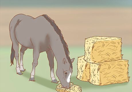 Feed horses 1.5–2% of their body weight in hay each day. Hay provides horses with carbohydrates and fiber but, unlike grasses, it contains very little sugar. As long as your horse is active and healthy, feed it up to 2% of its body weight in dry, high-quality hay daily. If you don’t have access to high-quality hay, you can substitute a horse feed purchased from a local tack store. So, if your horse weighs 800 pounds (360 kg), give it 12–16 pounds (5.4–7.3 kg) of hay daily.