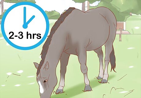 Let your horses eat in a grassy pasture for only 2–3 hours a day. Green pasture grass contains high levels of starch and sugar, which may trigger laminitis if horses eat too much of it. To guard against laminitis, when lush grass starts growing tall around spring time, turn horses out to pasture for only 2–3 hours, then bring them back to their paddock. In general, you don’t need to monitor how much grass horses eat during their 2–3 hours of grazing. Only in the case of an overweight horse will you need to restrict the amount of food you give to your horse. Do this only in consultation with a veterinarian. Try a grazing muzzle if your horse is overweight or you don't have a dry paddock for your horse after their grazing period. This will control how much your horse can eat. Preventing laminitis may mean changing horses’ pasture schedules to protect them from consuming too much starch and sugar. Try turning your horses out at night when the starch and sugar content in the grass isn’t as high.
