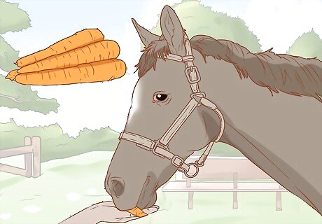 Feed horses only 1–2 portions of sugar- and starch-rich foods a week. While horses like to eat sweet foods, they can have a harmful effect on the health of the horse’s feet. It’s fine to give your horse a sweet treat 1–2 times a week, but sugary and starchy food shouldn’t make up a large portion of the animal’s diet. Foods rich in sugars and starches include apples and other fruit, carrots, grains, and sweet green grass. If you notice a horse’s hooves becoming brittle, or if a farrier suspects your horse may be susceptible to laminitis, cut out these foods altogether. For example, each week, you could give your horse 1 apple and 1 carrot. If you’re concerned about laminitis, work closely with your veterinarian to figure out a dietary plan that works for your horse.