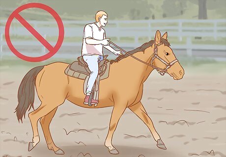 Avoid riding on rough terrain if your horse doesn’t have shoes on. Good riding practices are an important part of preventing laminitis. If your horse isn’t shod and will be moving quickly along any hard surface (including asphalt, concrete, and rocks), its hooves could be concussed. These hoof concussions and bruises can leave the animal at risk for foot ailments, including laminitis. So, either ask your farrier to put shoes on your horse, or stick to riding on soft surfaces. If you use your horse for work (e.g., pulling a carriage or farming), make sure to shoe the horse before having it work on hard surfaces. Repetitive stress injuries from riding unshod on hard surfaces can cause laminitis.