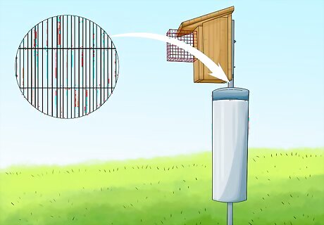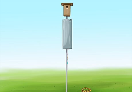 Slip the stovepipe baffle over the pole. Do this once the hanger claps are secure. Slip it over the pole until it rests on top of the hanger clips. To discourage predators, the baffle should wobble a little bit. When mounting the nesting box on the pole, the bottom of the box should be only three to four inches away from the top of the stovepipe baffle. This will encourage snakes to go inside of the baffle and get stopped instead of climbing over the outside of the baffle.