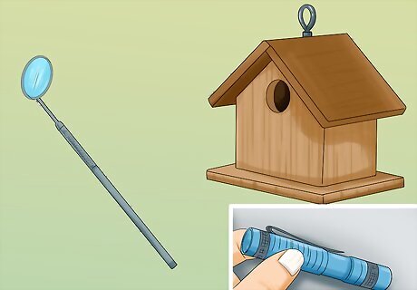 Place a small mirror in the box. A small mirror is helpful to look inside the nest without disturbing it. Install a small mechanic’s or dental mirror just inside the entrance hole. Shine a small penlight at the mirror. The light will bounce of the mirror allowing you to see the nest with minimal disturbances. Use super glue to secure the mirror inside the box.