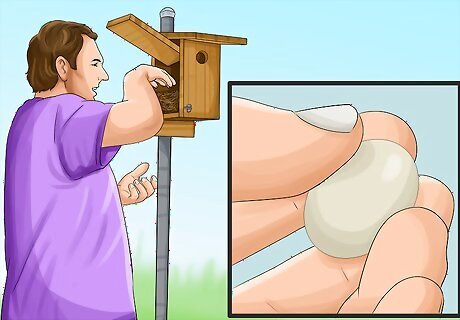 Look for pests. There are a variety of pests that can make a home out of your nesting box. These pests include House Sparrows, paper wasps, fire ants, bumblebees and honeybees, blowfly larvae, mice, and snakes. When monitoring the box for these pests, always use caution and never reach in with your hands. House Sparrows are non-native birds that may attack and destroy eggs, nestlings, and incubating adults of native bird species. By identifying a House Sparrow's eggs, you can remove their nests from your box. Because these birds are non-native species, you may legally remove their nests, eggs, and young. A House Sparrow's eggs may be cream, white, grey, or green in color. All of the eggs are speckled with irregular fine, brown speckles. The shell is also smooth with a slight gloss.