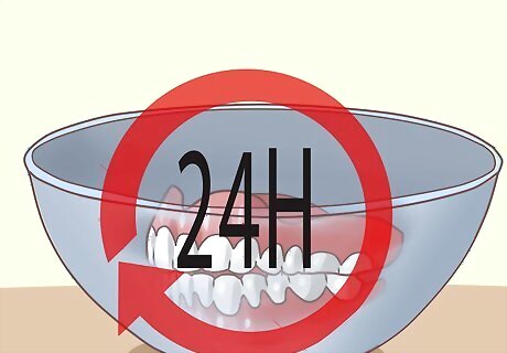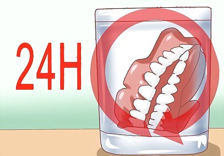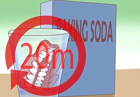 Soak your dentures in the solution. Leave your dentures soaking in the mixture of baking soda and water for 20 minutes.