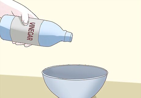 Mix vinegar and water. Because it contains acetic acid, vinegar also works to remove some stains. Start by mixing one part distilled white vinegar to one part water in a bowl large enough to fit your dentures.