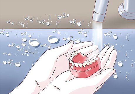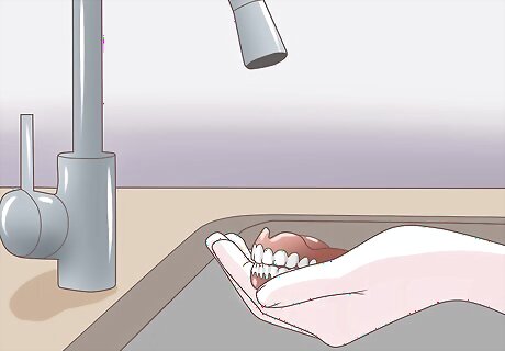 Rinse your dentures. After soaking, rinse your dentures with plain tap water. Don’t scrub them with anything abrasive.