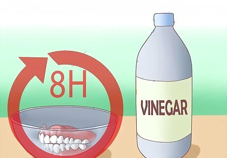 Soak your dentures in the solution for eight hours, or overnight. Allowing at least eight hours to pass will give the acetic acid time to dissolve all tartar. If you don’t have eight hours, you can try a shorter soak. Even half an hour will dissolve some tartar.