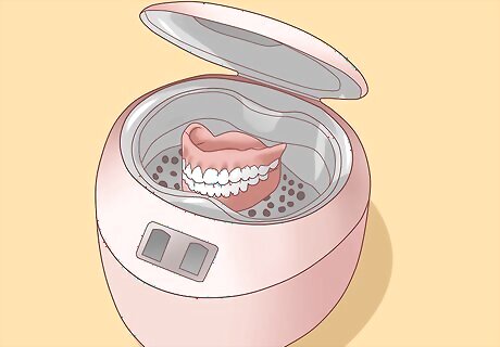 Ask about ultrasonic cleaning. When you go to the dentist, ask if ultrasonic cleaning might work for you. Your dentist can use this technique to cleanse your dentures with sound waves. It sounds strange, but ultrasonic cleaning is one of the most effective means of eliminating stains and preventing deposits from forming.