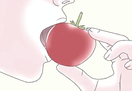Eat crunchy fruits and vegetables. Foods like berries, tomatoes, soy sauce, and balsamic vinegar will stain your dentures, but you can mitigate the damage by eating crunchy fruits and vegetables, like apples and celery. These foods will naturally cleanse your dentures.