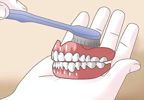 Brush well. You should brush your dentures at least twice daily, just as you would brush your teeth. Make sure that your brush reaches every part of the dentures, but don’t push down too hard: you don’t want to break them. Consider buying a special toothbrush made for dentures. Use a toothbrush with soft bristles. Hard ones can scratch your dentures, reducing their sheen.