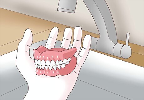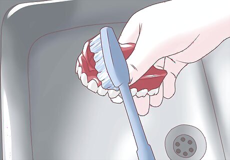 Brush your dentures. Remove your dentures from the solution and, using a soft-bristled toothbrush, brush them as you usually would. Don’t scrub them with anything too abrasive.
