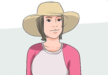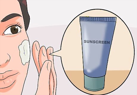 Use broad-spectrum sunscreen any time you're in the sun. Sunscreen protects you from the sun's radiation, but not all sunscreen is the same. Many sunscreen products only protect against one type of radiation, but your skin can be damaged by both UVA and UVB radiation. Health experts recommend that you use broad-spectrum sunscreen, which guards your skin against both types of radiation. Choose sunscreen with a sun-protection factor (SPF) of 30 or higher. Sunscreen doesn't necessarily work instantaneously. Make sure you apply sunscreen about 15 to 30 minutes before you plan on being out in the sun. Reapply sunscreen at least every two hours. If you go swimming or sweat a lot, you should reapply sunscreen more frequently. When you are around water, the reflection from the water can increase the strength of the sun's rays, increasing the chance of sun damage. Use sunscreen even when the day is gloomy or overcast. Applying sunscreen can also help prevent existing sunspots from becoming darker.