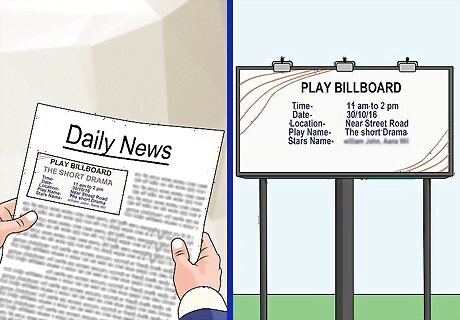 Promote the play. Promotion is an essential part of the producer's job and perhaps the most important factor in determining whether your venue is packed on opening night. You'll want to get the word out about your play with every method that's within the limitations of your budget. You might, for instance, buy ad time on the radio or television, rent out a billboard, or distribute flyers at local universities. Depending on how "big" you're willing to go with your promotion efforts, the amount of money you spend on your production's advertising budget can range from insignificant to enormous. Not all of your options for promotion cost money. If you can attract a newspaper or local news channel to your production to do a story, for example, you'll get publicity for free. Also, the internet offers plenty of zero-cost options for promotion, as social media and email are completely free.