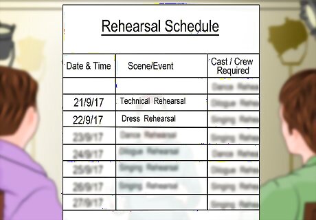 Set a rehearsal schedule. Plays require extensive preparation and rehearsal to be ready to perform in front of a live audience. Collaborate with the director to create a rigorous but reasonable schedule that gradually increases in intensity as the opening night approaches. Keep in mind the price and availability of practice space and the dates of other events at the venue you've chosen. Some theater resources recommend scheduling at least one hour of rehearsal time for every page in the script. Be sure to reserve time at the end of your rehearsal schedule for technical rehearsals and at least one dress rehearsal. Technical rehearsals give the actors, director, and crew a chance to run through the play and work out any kinks in the technical aspects of the production - lights, sound cues, costumes, and special effects. Dress rehearsals consist of performing the play in its entirety as if an audience was watching with no breaks or stops. For instance, if an actor forgets his or her lines, the show must continue, as it would during an actual performance.