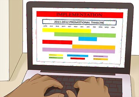 Create a promotional timeline. In order to promote a festival effectively, you need to start promotion early, but not so early that people forget about it when the time comes. Start promoting a small festival a few months before it is set to happen. Do a few promotions to get the word out that the festival will occur at first. Then, when the festival is only a few weeks away, increase the amount of promotion you are doing. Some promotional activities, such as creating a website, can be done several months before the event. Having the site online will not cost you much and will allow people to find information when they want it. Paid advertisements, such as those run in local papers, should be done a few weeks in advance and up to the week of the event, so that people are sure to set the day and time aside to attend the event. Starting promotion too early can also cause you to spend most of your budget early on, leaving few resources for the final push leading up to the festival.