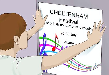 Create fliers and distribute them. To get the word out, it is a good idea to make advertising posters and fliers that can placed in areas where your demographic may congregate. Try to make the flier impactful by putting an image or caption on it the will grab people's attention. However, also include basic information, such as the date, time, and location of the festival. For example, if you are promoting a kids music festival, put up fliers in places where kids congregate, such as libraries, toys stores, parks, and near schools. If you are promoting a film festival, put the fliers up around theaters in your town.