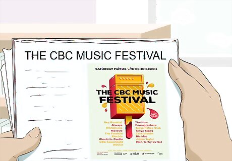 Buy advertising time and ad space. In order to get people to come to your festival, you should create ads that tell them where, when, and what your festival is about. For example, these ads can be print ads that are put in local papers and on social media. At minimum, your ads should include the name of the festival, the location, the date, the time, and a web address where people can find additional details.