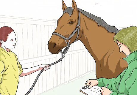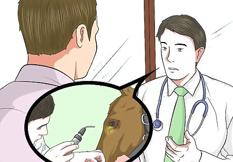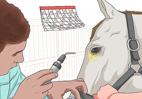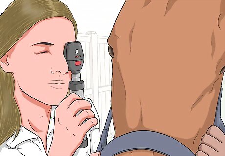 Schedule regular check-ups with your vet. To keep your horse healthy and safe from eye issues, you should have regular check-ups with your horse’s vet. You may have monthly check ups with your vet or a check-up scheduled for every few months. As part of the exam, you vet should examine your horse’s eyes to confirm there are no issues or injuries.