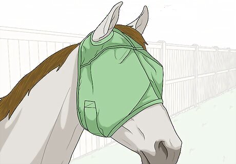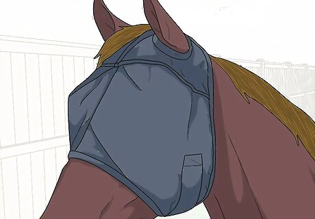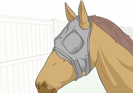 Make your horse wear protective head gear. You can also prevent eye injuries by getting your horse used to wearing protective head gear, such as a fly mask. Having your horse wear a fly mask can ensure dirt, debris, and other objects do not get into their eyes. You may also make sure your horse wears a fly mask in situations that could lead to eye injuries, such as dusty or dirty areas or aggressive horses that could end up kicking or hitting your horse’s head. You can also find foam padding for your horse to wear while traveling in a trailer. This will protect its head and eyes.