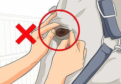 Try placing an eye patch on the horse. You can also protect the injured eye by putting a protective patch on your horse’s eye. You may look for a protective eye patch made for horses at your local horse supply store or online. When you put on the eye patch, make sure it sits right above your horse’s injured eye. It should be flush to the area, as you do not want dust or debris to get into your horse’s injured eye.