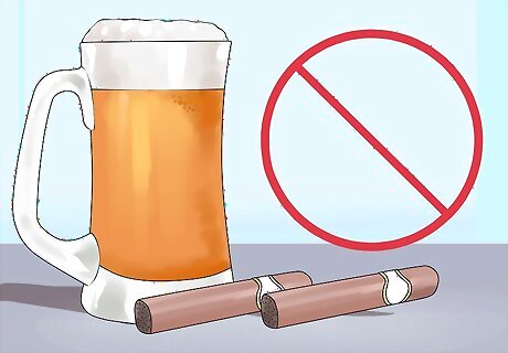 Reduce your tobacco and alcohol consumption. Avoid smoking and other forms of tobacco use altogether, and moderate your drinking in order to maintain good bone health. Studies have indicated that prolonged tobacco use—whether cigarettes or chew tobacco—has a detrimental effect on bone strength. Excessive alcohol use—more than two drinks every day—is also linked to a higher risk of osteoporosis. Excessive alcohol consumption is detrimental to your bone health, as it diminishes your body’s ability to form new bone cells.