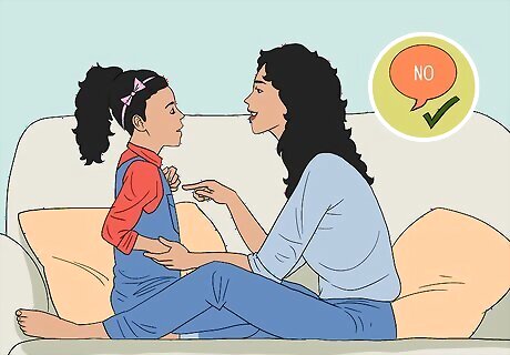 Teach your child about bodily autonomy and the right to say no. Make it clear that if someone says they don't want to be hugged, poked, teased, kissed, tickled, or touched in any other way, this needs to be respected. Teach respect for boundaries in basic settings, like friends playing and siblings messing around, and they will have the skills to say no and recognize that it is not okay if others disregard that no. Let your child have the right to decline hugs and kisses at any time. If they aren't in the mood to hug Grandma, they don't have to. If a child is disregarding another's boundaries, e.g., a brother pulling his sister's hair after she asked him to stop, step in. Say, "She said she doesn't like that, so you need to stop." This reinforces the importance of respecting a no.