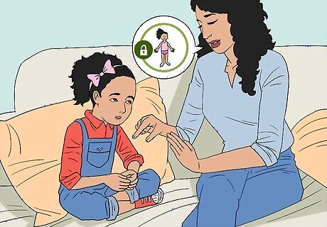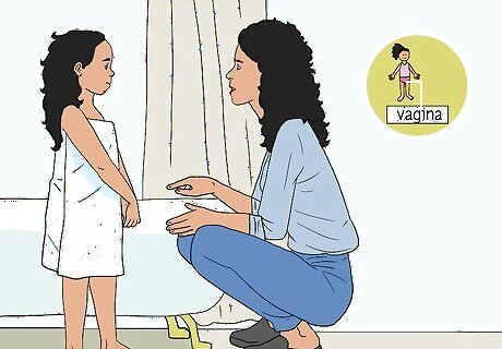 Teach your child which body parts are private. Before your child reaches the age of 3, begin telling them which parts of their body should not be touched or photographed by other people. It’s also important to let them know that nobody should ask your child to touch or look at someone else’s private parts. Bring this up repeatedly until your child understands. This will help your child quickly learn to recognize inappropriate behavior on the part of an adult or another child.Tip: A notable exception to these rules about touching is when a physician examines your child for medical reasons. Even this should be supervised by a parent until the child is old enough to protect themselves. Teach your child about this exception. Once your child no longer needs their diapers changed, no other person should ever come into contact with their genitals, aside from a doctor or other healthcare provider. For example, you might say something like, “Your vulva is a private part of your body. It’s not okay for anyone else to touch it except for a doctor or nurse if they have to give you a checkup, and I’ll be in the room with you when that happens.” Explain that it is sometimes okay for private parts to be seen by other people as long as the visibility is merely incidental and the action is not sexual in nature. Examples could include sharing a bedroom with siblings, walking to and from the shower, peeing in a urinal, or changing in a locker room.