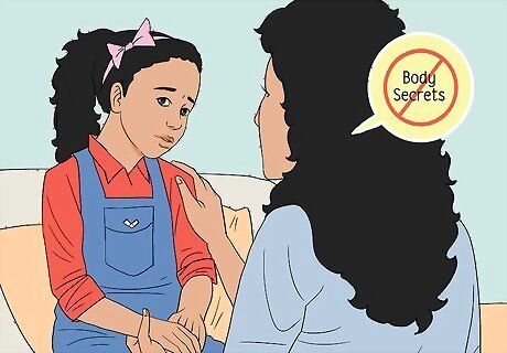 Let your child know that “body secrets” aren’t okay. Many abusers encourage their victims to keep the abuse secret. Explain to your child that these kinds of secrets are bad, and they should always tell you if someone tries to make them keep a secret about their body or about touch. These kinds of secrets may be threatening, or they may sound more innocent. For example, the abuser might threaten to hurt the child, take something from them, or get them in trouble if they tell. They might also say something like “If you tell anyone what happened, they won’t let me play with you anymore!” Explain to your child the difference between harmful secrets and safe secrets (such as not telling their sibling about a birthday present).