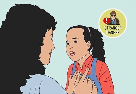 Teach your child about how to be safe with "strangers". Tell your child that they should never enter a stranger's house or car, accept gifts or food from a stranger. However, let them know that they can approach “safe strangers,” such as police officers, firefighters, teachers, or librarians, for help if necessary. But, teaching "stranger danger" isn't a good idea since most of the harms happen by someone the child already knows. Instead, teach them "tricky people", which asks them to identify potential predators by behavior. Teach your child “No, Go, Yell, Tell”: Tell your child that if a stranger tries to approach them, offer them something, or take them somewhere, they should say “no” and run away while yelling as loudly as they can. They should then tell a trusted adult what happened as soon as possible. Tell your child to never open the door to someone they don't know. You can make specific exceptions to this rule as you see fit (such as emergency situations when police or paramedics are needed). Tell your child to never reveal to anyone that they are home alone (should this ever be the case), and that this rule applies to in-person situations as well as over the phone and online. If someone asks, your child can say that you are at home but busy. Tell them that lying is okay in this scenario to protect them. Inform your child that you can't tell whether someone is dangerous by their appearance, and that some bad people may appear normal or act nice.