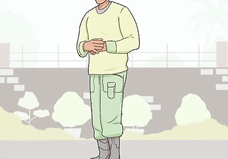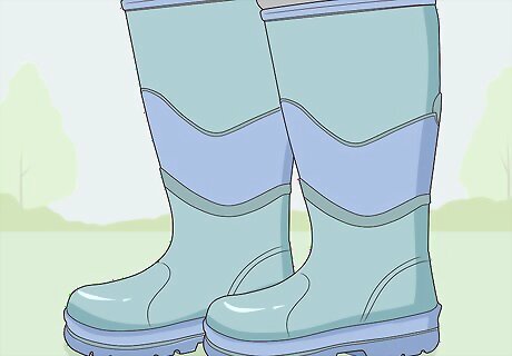 Put on sturdy shoes while you’re working outside. Look for shoes that are comfortable to wear, waterproof, and flexible so you can easily get to your plants. For the maximum amount of protection, wear rubber boots so water can’t get inside and to keep your feet safe from any sharp tools you’re using. If you want something more casual, wear rubber slip-on shoes for walking around your garden doing simple tasks, like pruning. Keep your gardening shoes clean after you’re done working for the day so they don’t get caked with dirt or mud. Avoid wearing slip-on shoes while watering or working with pesticides and fertilizers so you don’t get wet or expose your skin to the chemicals.
