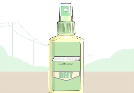 Spray insect repellent with DEET to protect from stings or bug bites. DEET is a bug repellent that also deters ticks, so spray it on exposed skin or your clothing to keep the bugs away. Read the repellent’s label carefully since it may tell you when to reapply or provide any special instructions you need to follow. To apply the bug repellent in hard to reach areas, like your face or the back of your neck, spray it into your hands and rub it into your skin. If you don’t want to spray insect repellent on yourself, you can also buy repellent capsules that you keep near you to keep bugs away. Spray the repellent around your shoes and socks since ticks are usually found in grasses low to the ground.