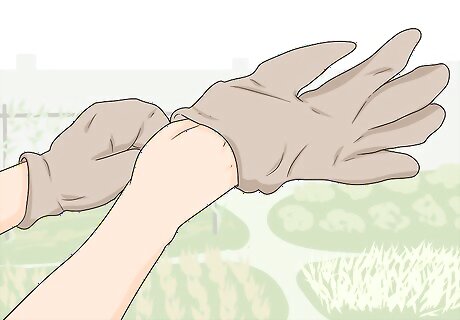 Wear thick gardening gloves while handling plants. Invest in a pair of leather gardening gloves to prevent any thorns or sharp objects from cutting through them and stabbing your hands. Make sure the gloves fit your fingertips exactly and that they aren’t too tight when you clench your fist. Avoid handling any of your plants without gardening gloves since the plants could have sap or chemicals that may irritate your skin. You can give your skin a little extra protection by applying a layer of petroleum jelly to your hands and putting on some latex or nitrile gloves. Then, put on your gardening gloves on top of those. Keep a few pairs of gardening gloves in your home so you have spares in case you accidentally rip or tear one. There are many types of gardening gloves that each have specialized purposes. For example, you may get pruning gloves to cover more skin and work with delicate plants.