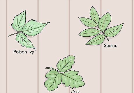 Learn to identify poison ivy, oak, and sumac to prevent rashes and irritation. Poison ivy, oak, and sumac have chemicals on their leaves and sap that can cause itching or rashes when they come into contact with your skin. Take some time to familiarize yourself with what each plant looks like so you can identify them if they’re in your area. When you find any, be careful not to touch them or only handle them if you’re wearing gloves. Poison ivy has 3 leaves at the end of each of its reddish stems, and the vines may have a hairy appearance. Poison oak can grow as a shrub or a vine and has 3 dark green leaves at the end of each of its red stems. The leaves and stems have “hairs” on both sides, and they produce tan-colored berries. Poison sumac is a tree that has leaves that look like a feather, and the stems have a reddish color. The tree can grow up to 30 feet (9.1 m) tall.