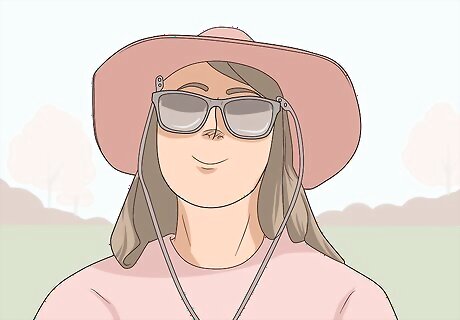 Put on a wide-brimmed hat and sunglasses for additional sun protection. While sunscreen can protect your face from sunburn, try putting on a hat that has a wide brim so your face is out of direct sunlight. Large pairs of sunglasses can also help block out harmful rays and make it easier to see while you’re outside. You can buy gardening hats online or from any outdoors store.