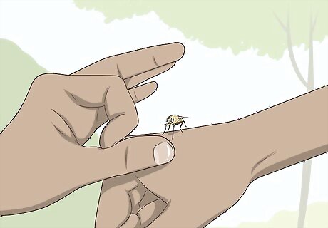 Flick bugs away rather than killing them if they land on you. If you slap or kill bugs that land on you, they’re more likely to bite you or sting. If you notice a bug on your skin, then use your thumb and forefinger to gently flick it away. Try to flick it from the side so you don’t accidentally get bitten or stung.